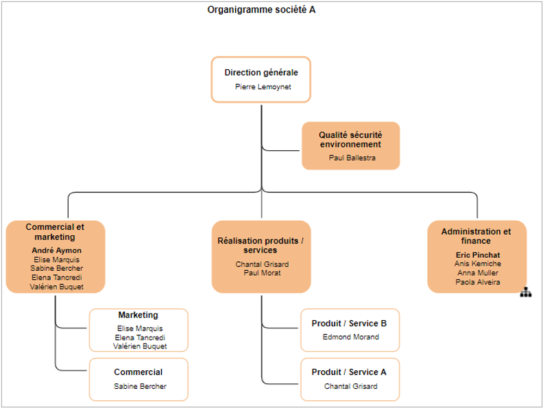 Lorsque vous créez/modifiez un organigramme, vous pouvez faire un lien vers un autre organigramme préétabli. Dans l'exemple ci-dessous, nous nous trouvons dans l'organigramme au niveau du groupe et nous faisons un lien depuis l'entité Société A vers l'organigramme détaillé de cette entité.