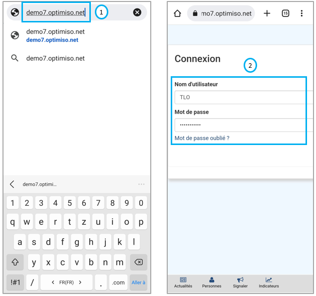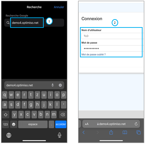 1. Entrer l'adresse URL d’Optimiso Suite dans le navigateur Internet de votre smartphone