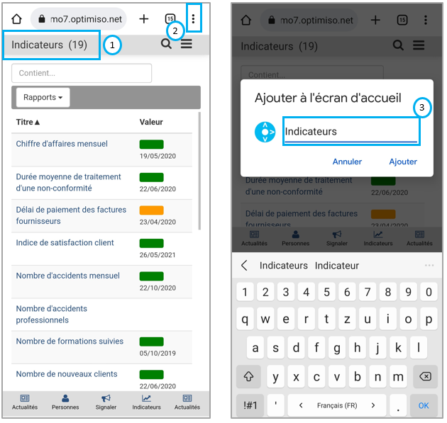 1. Aller sur la page sur laquelle vous souhaitez créer un raccourci, ici Indicateurs