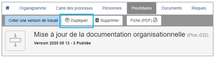 Pour dupliquer une procédure, aller sur la procédure en question puis cliquer sur le bouton Dupliquer.
