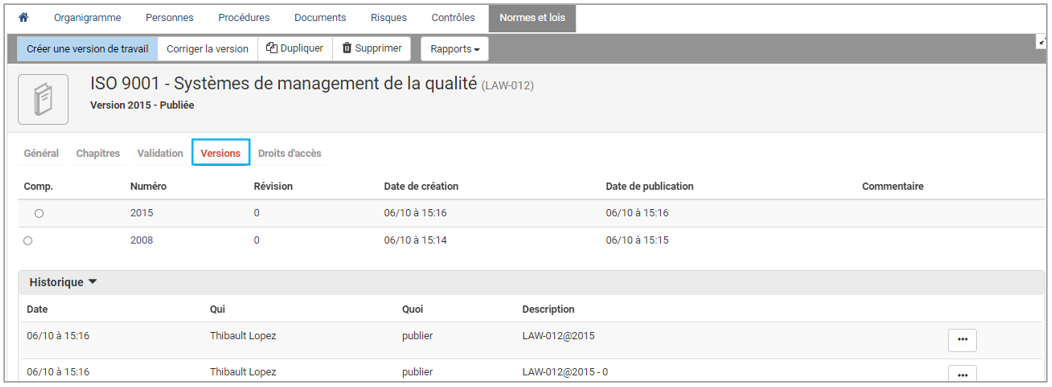 Ci-dessous l'exemple de l'historique des versions sur la norme ISO 9001.