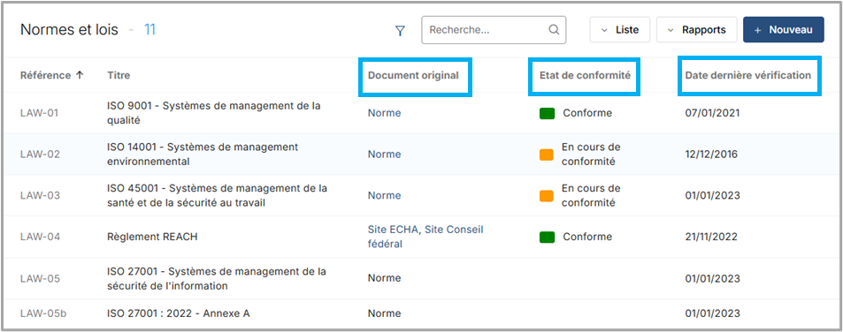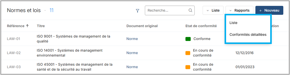 à un audit. Il vous permet de refaire un point sur ce qui a été mis en place.Vous pouvez générer des rapports depuis la vue en liste en