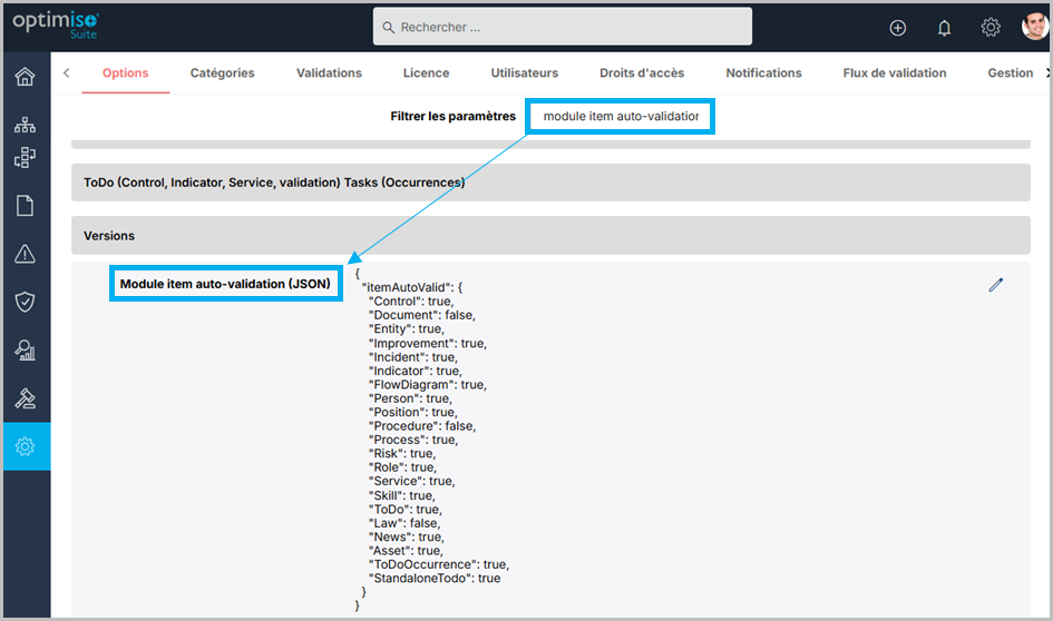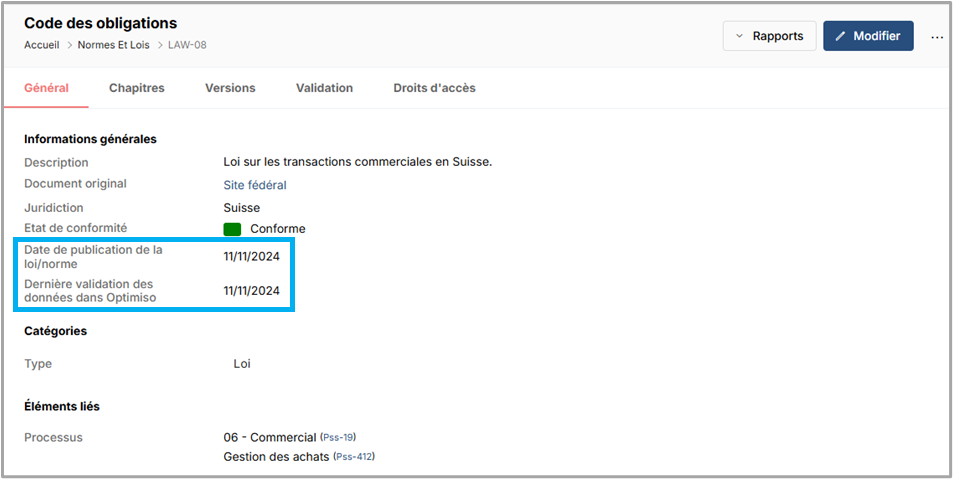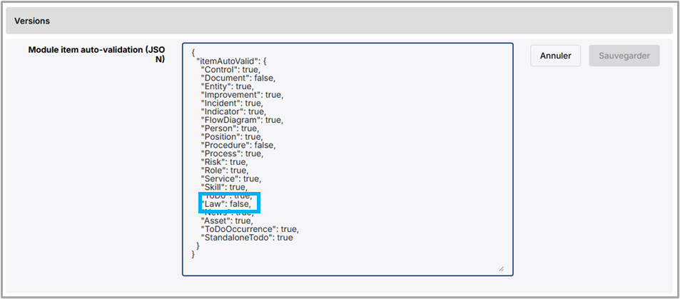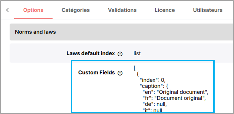 Vérifier que l'onglet Versions soit disponible pour les administrateurs dans la section Norms and laws des options :Champs libres à paramétrer :