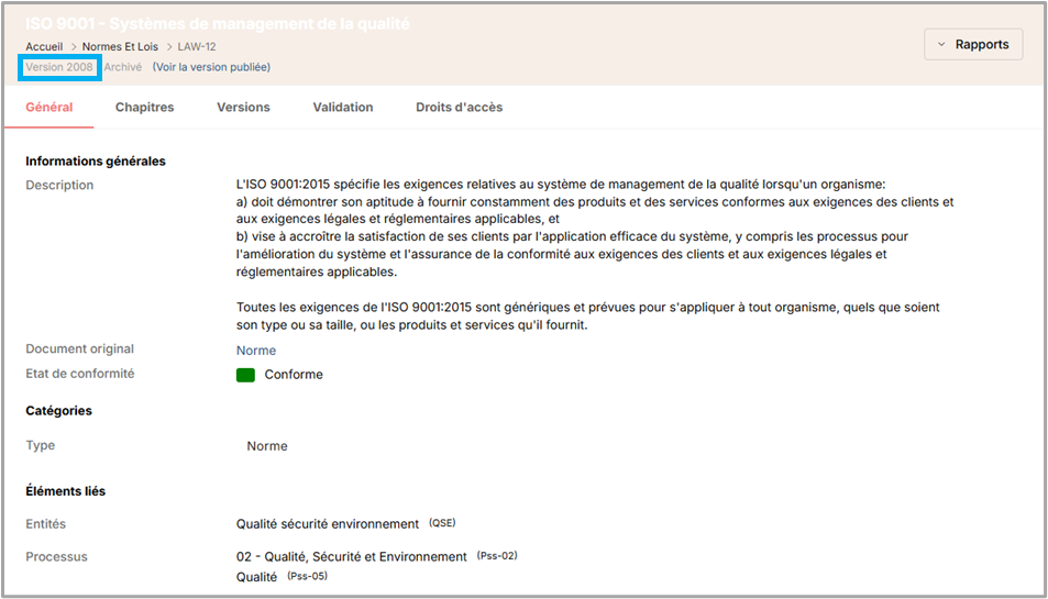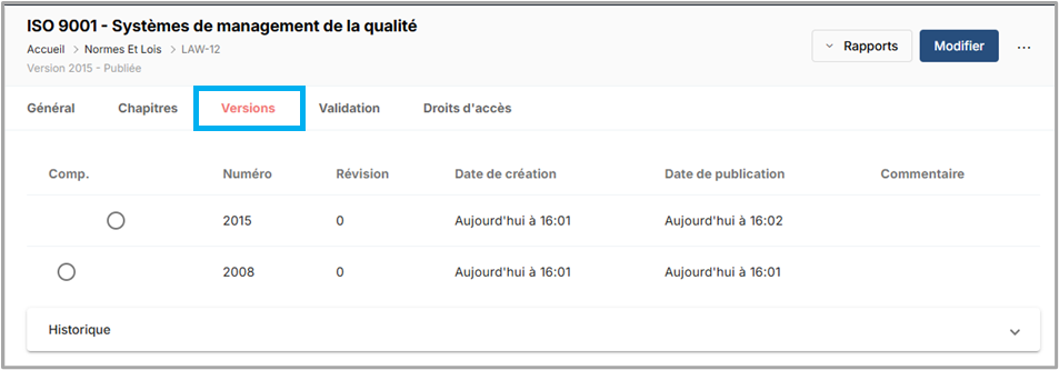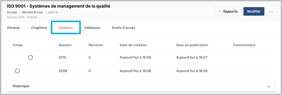 Ci-dessous l'exemple de l'historique des versions sur la norme ISO 9001.