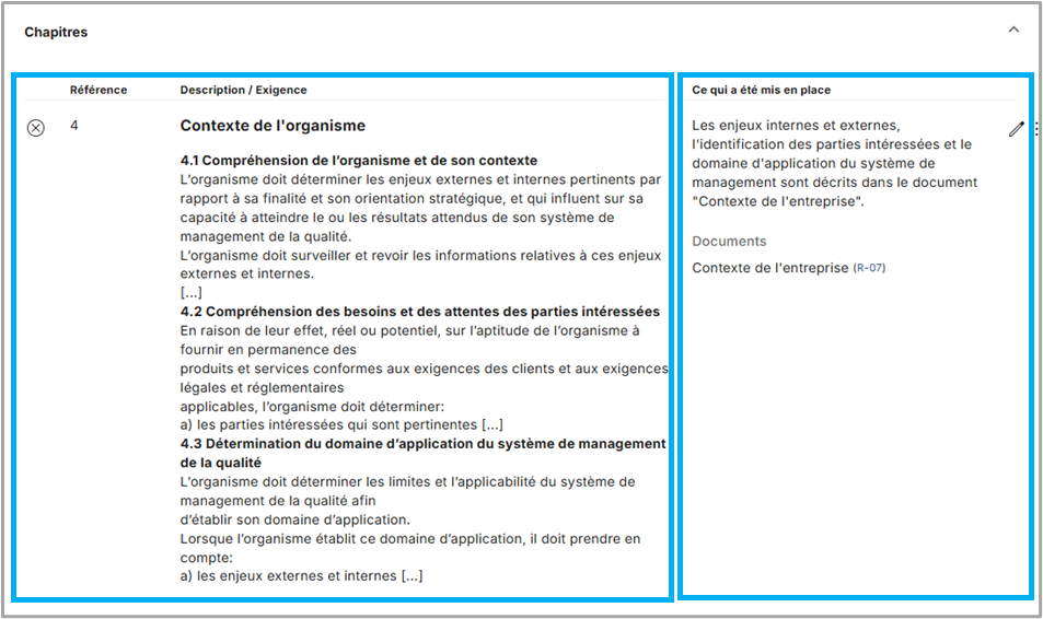 Retrouvez les codes des champs libres au chapitre 4Pour aller plus dans le détail, vous avez la possibilité dans la partie Chapitres d’aller remettre les points de la loi ou de la norme.