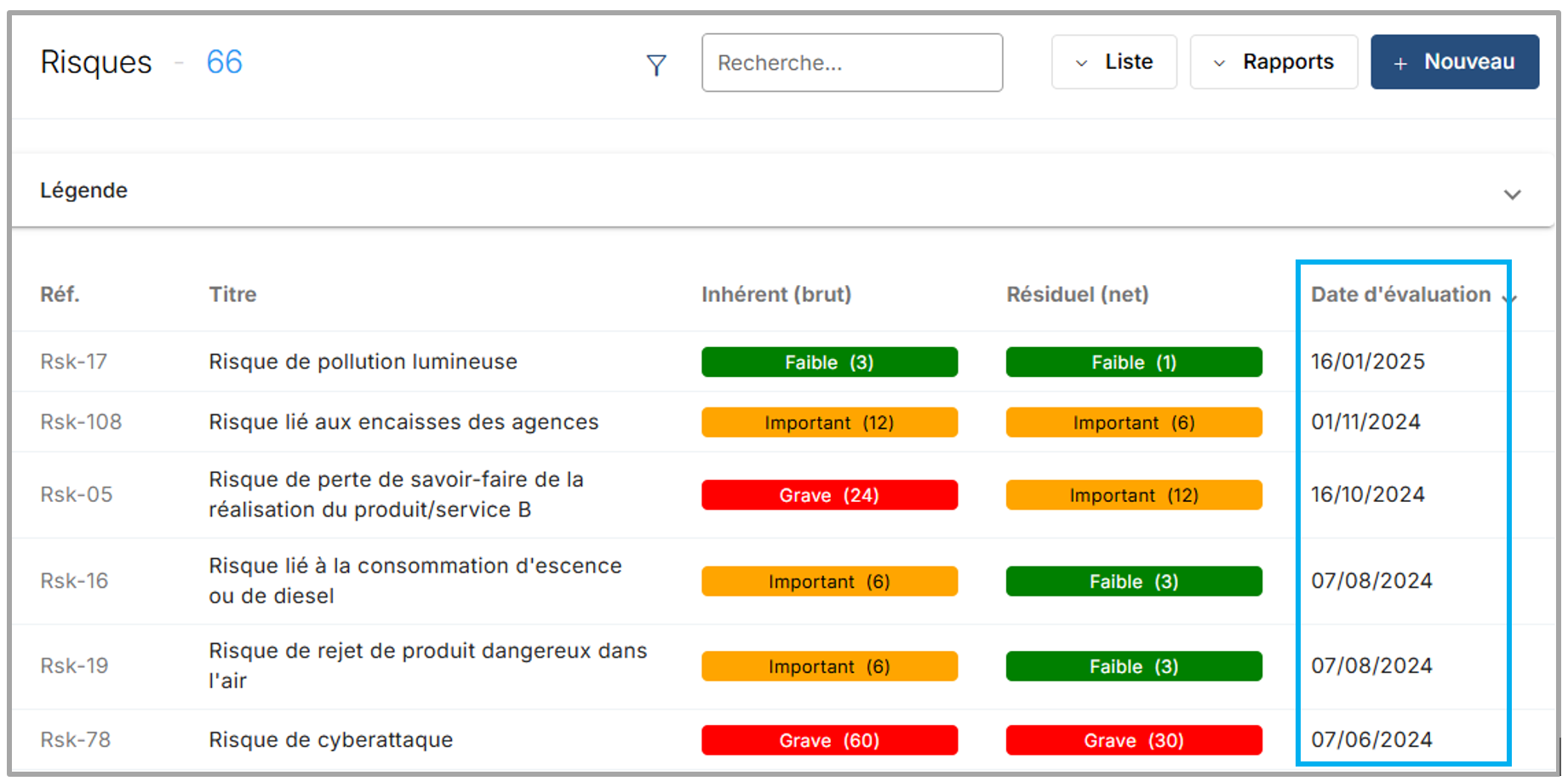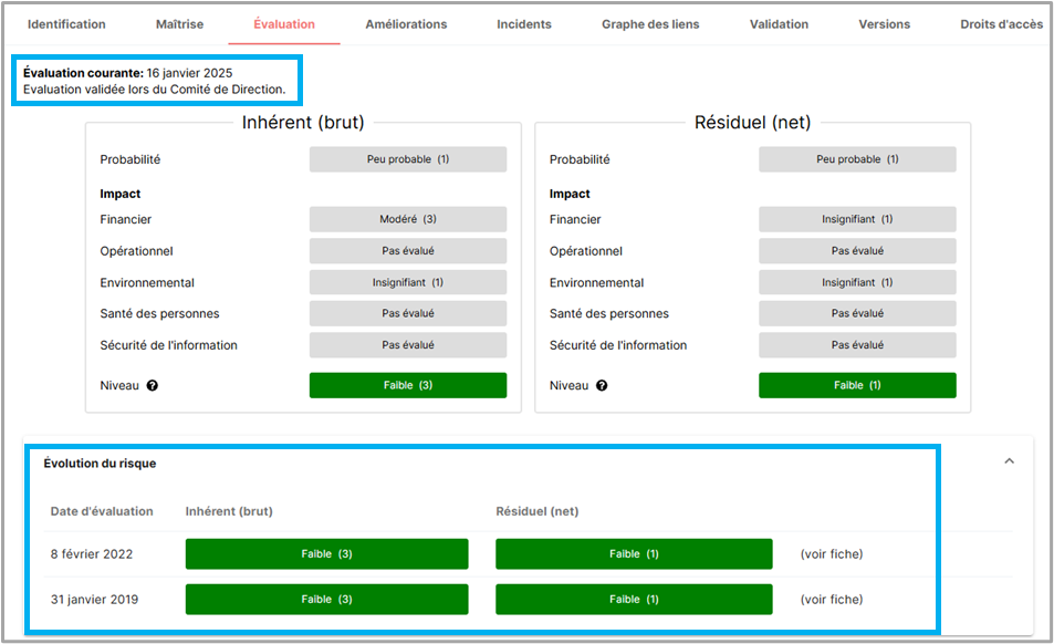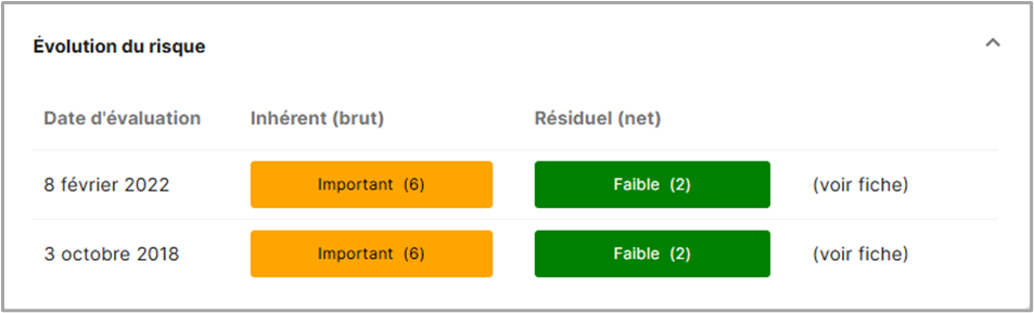 est inférieure à la 2.0, consulter cette formation.En figeant l’évaluation de vos risques, vous disposez d’un historique de vos évaluations et vous suivez facilement l’évolution de vos risques dans le temps. En cliquant sur voir fiche, le risque s’affiche tel qu’il était à la date définie.
