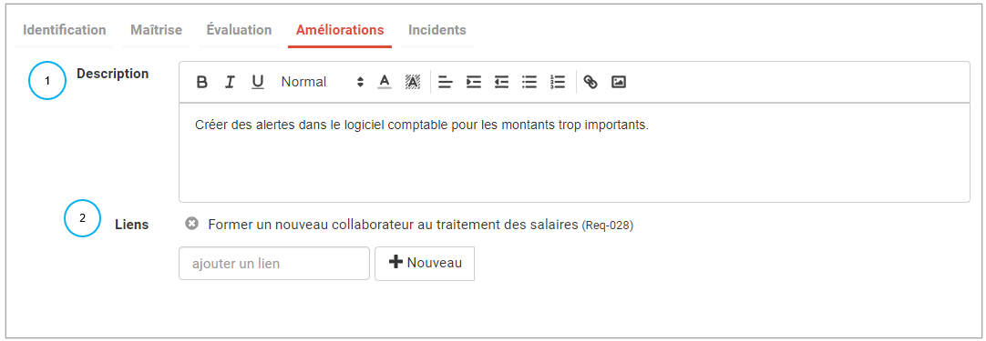 - la zone de liens pour lier votre risque à l’amélioration existante