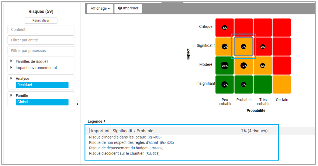 L’affichage en matrice est très utile pour consulter l’ensemble des informations sur vos risques avec leur moyens de maîtrise et de procéder de manière efficace à une revue de vos risques.