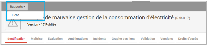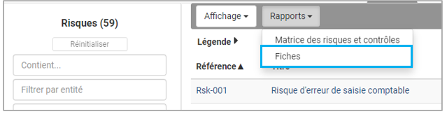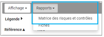 Pour exporter la matrice des risques et contrôles, cliquer sur le bouton Rapports depuis l'affichage en liste ou en matrice.