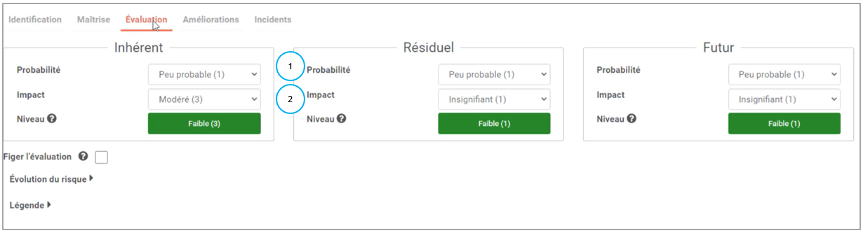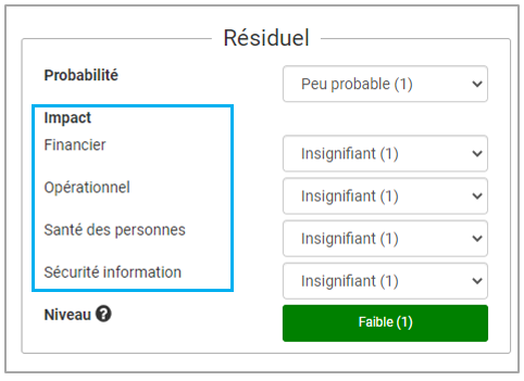 Remarque : Le calcul du Niveau de risque se fait automatiquement et correspond à la probabilité x l’impact. Si vous avez paramétré plusieurs impacts, celui avec la note la plus élevée est prise en compte.