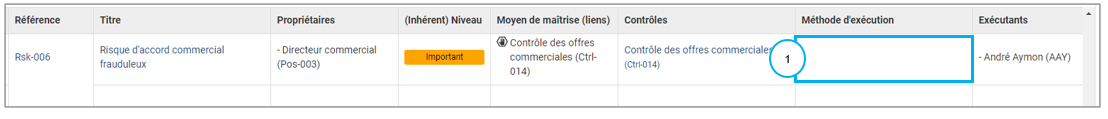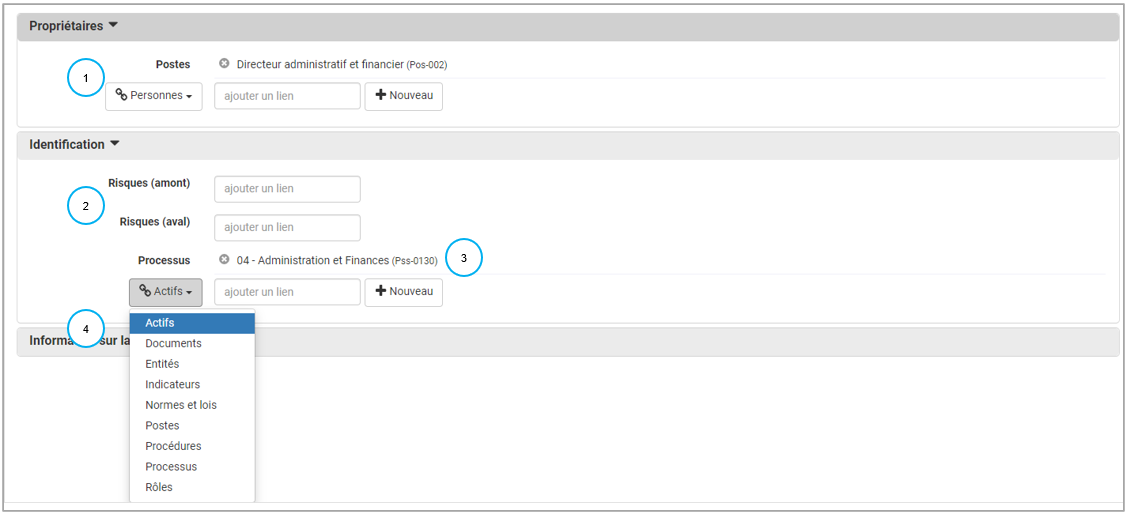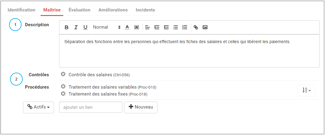 - les liens pour allez chercher les moyens de maîtrise existants dans les autres modules du logiciel. Par exemple faire un lien vers
