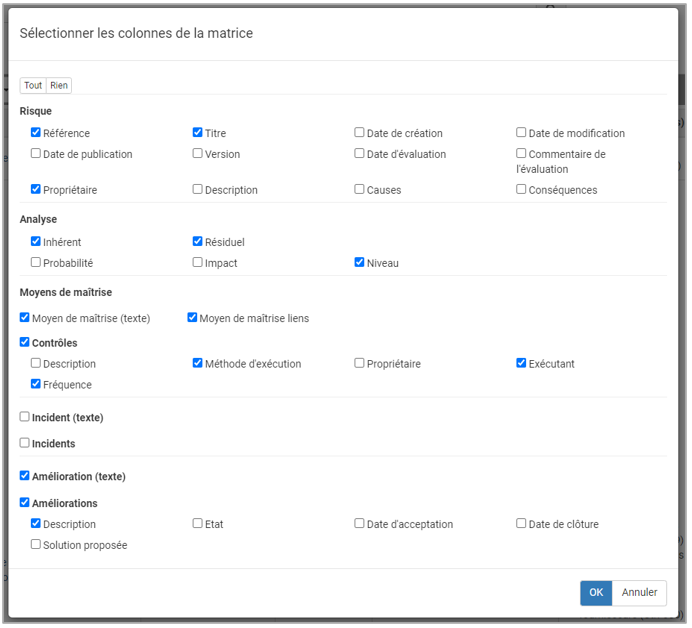 Sélectionner les colonnes à afficher et cliquer sur OK pour mettre à jour la matrice