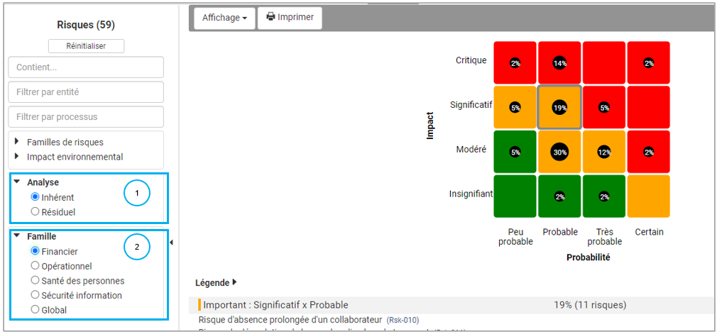 Cet affichage comprend, dans le cas présent, le risque inhérent et le résiduel dans la même cartographie.