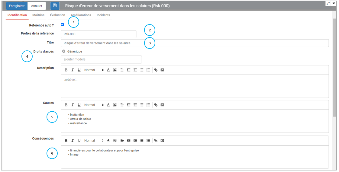 5. indiquer les causes et conséquences de la survenance du risque dans des champs libres (Si vous n'avez pas ces champs existants dans votre base, regarder la formation