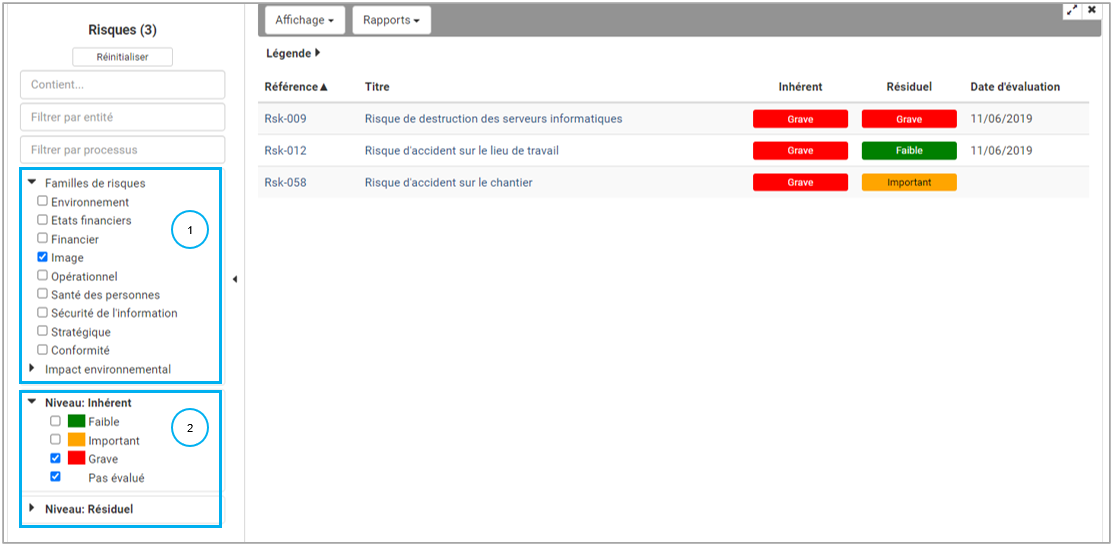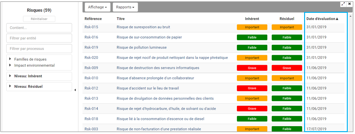 Retrouver la liste de l’ensemble de vos risques avec leur évaluation ici inhérente et résiduelle. Nous avons également une colonne avec la date de la dernière évaluation effectuée sur nos risques. Il est donc très facile de trier cette colonne pour voir les risques qui n’ont pas été revu depuis un certain temps.