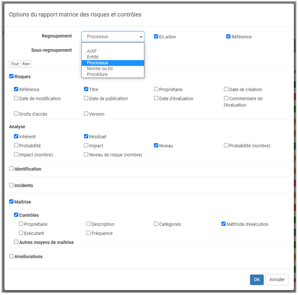 - Vous pouvez aussi choisir de regrouper les risques par processus, actif, entité, normes et lois ou par procédure.