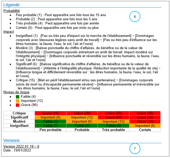- Légende : qui définit les différents niveaux de Probabilité et d’Impact. Celle-ci est paramétrable dans les Options du logiciel