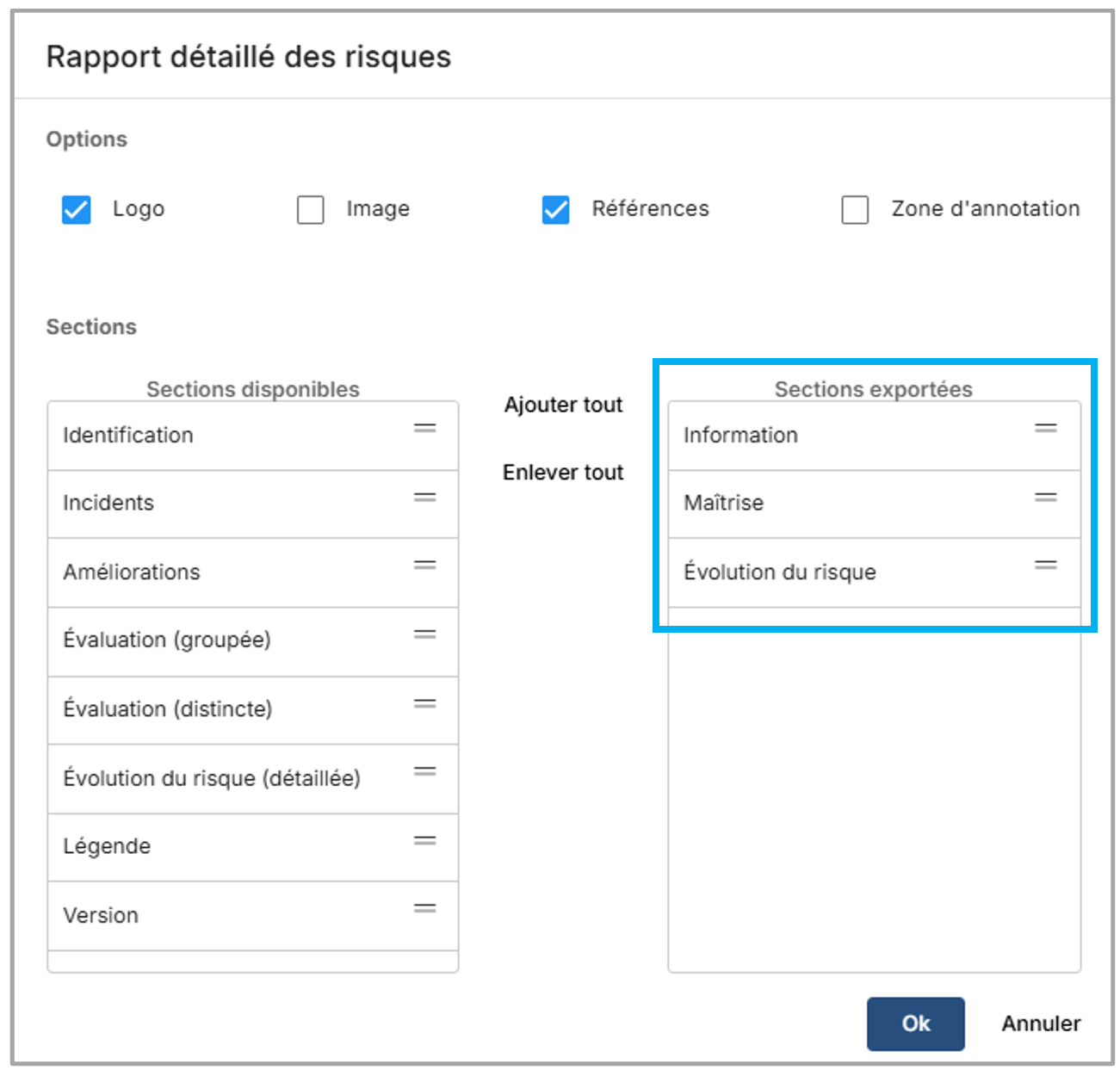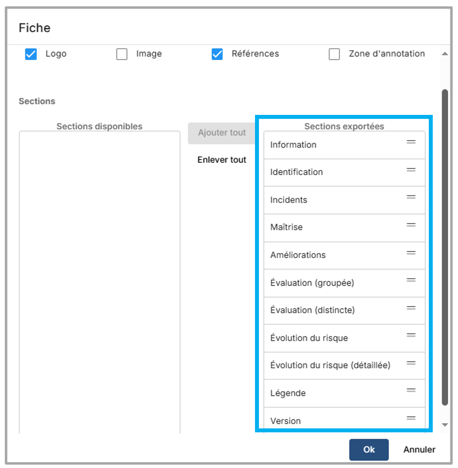 Sélectionner les sections à faire afficher sur le document. Ci-dessous, vous aurez le détail de chaque section.