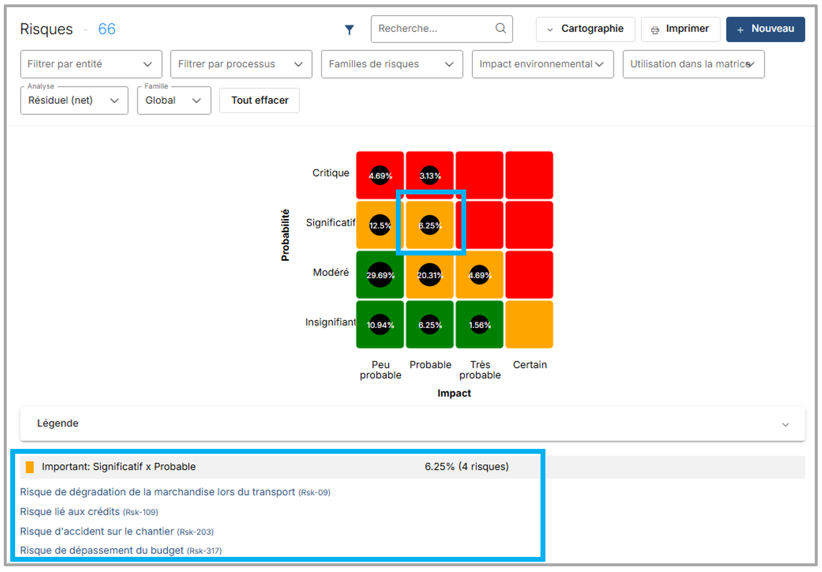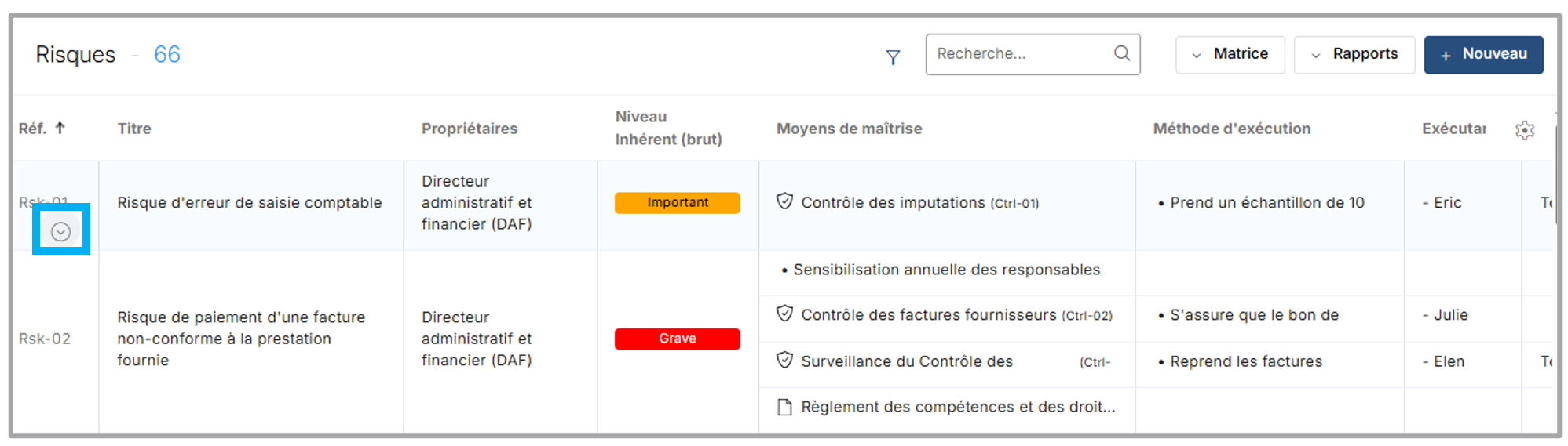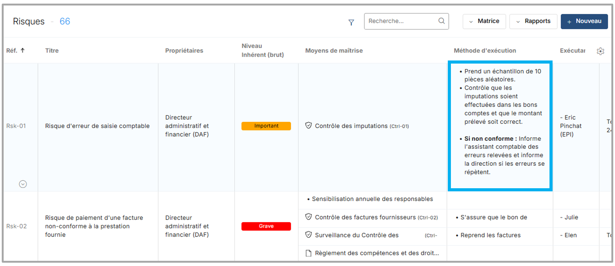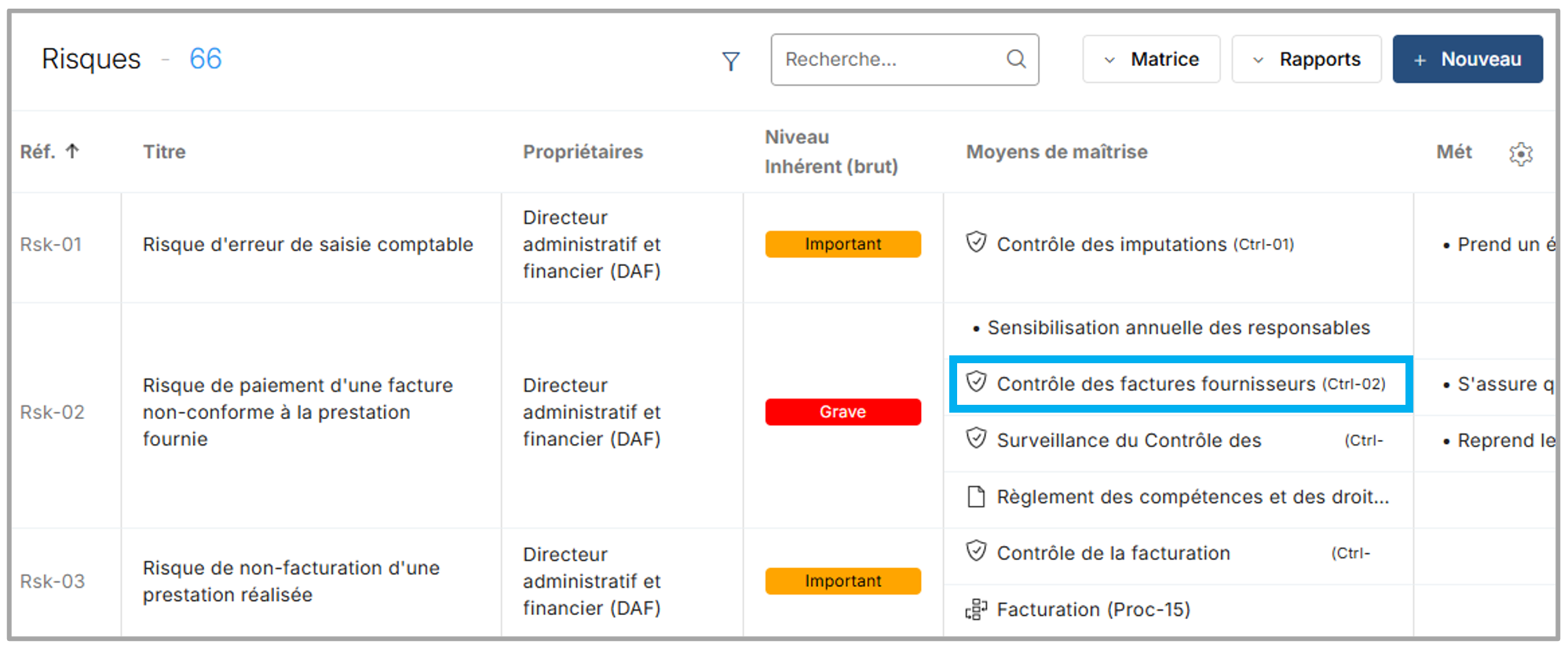 L’affichage en matrice est très utile pour consulter l’ensemble des informations sur vos risques avec leur moyens de maîtrise et de procéder de manière efficace à une revue de vos risques.