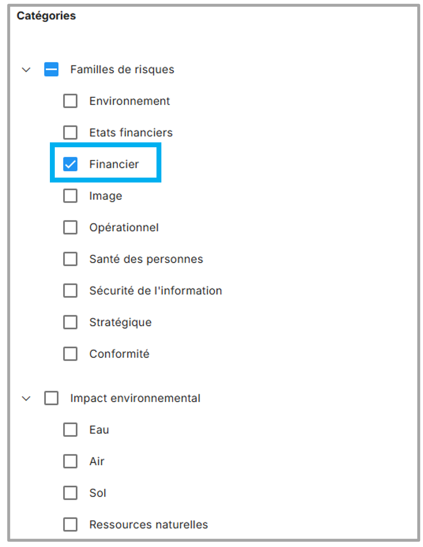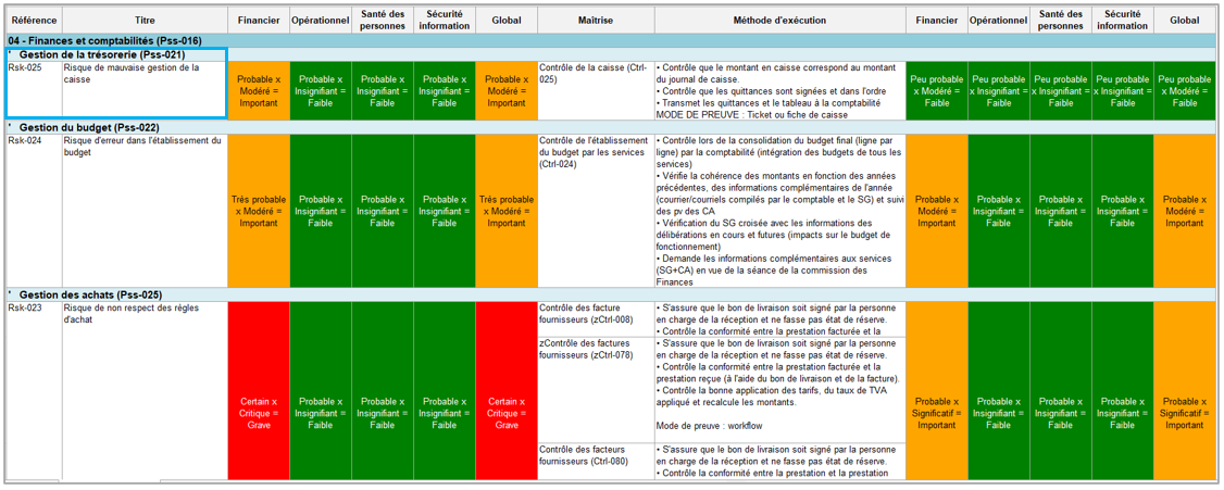 Dans cet exemple, les risques sont regroupés par processus en arbre. Pour cela les risques ont été lié uniquement au processus niveau 2 de processus. Par exemple, le Risque RSK-025 a été lié au processus Gestion de la trésorerie et non au processus de niveau 1 Finance et Comptabilité.