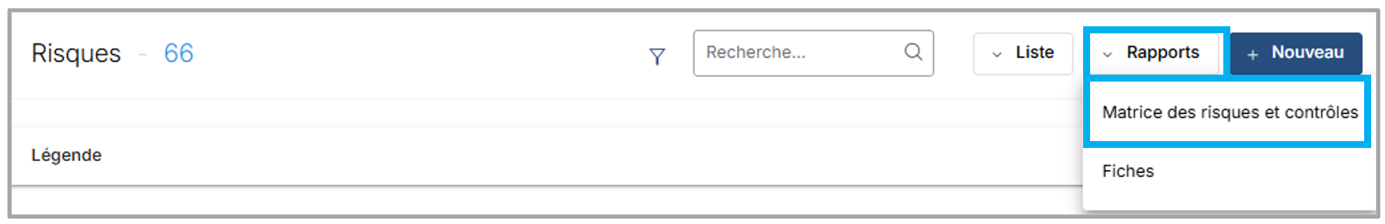 Pour exporter la matrice des risques et contrôles, cliquer sur le bouton Rapports depuis l'affichage en liste ou en matrice.