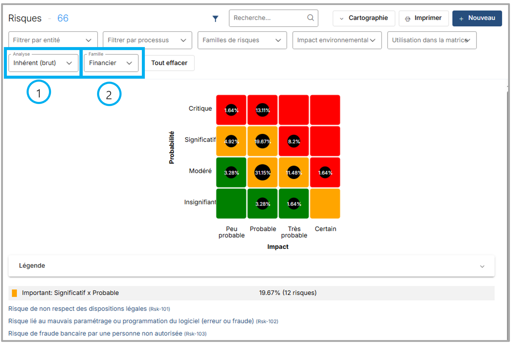 Cet affichage comprend, dans le cas présent, le risque inhérent et le résiduel dans la même cartographie.
