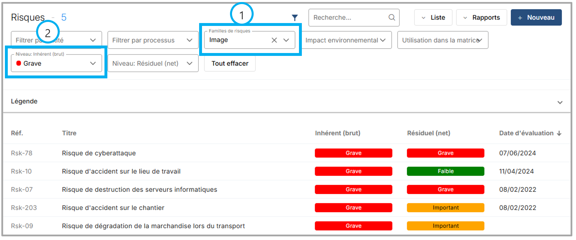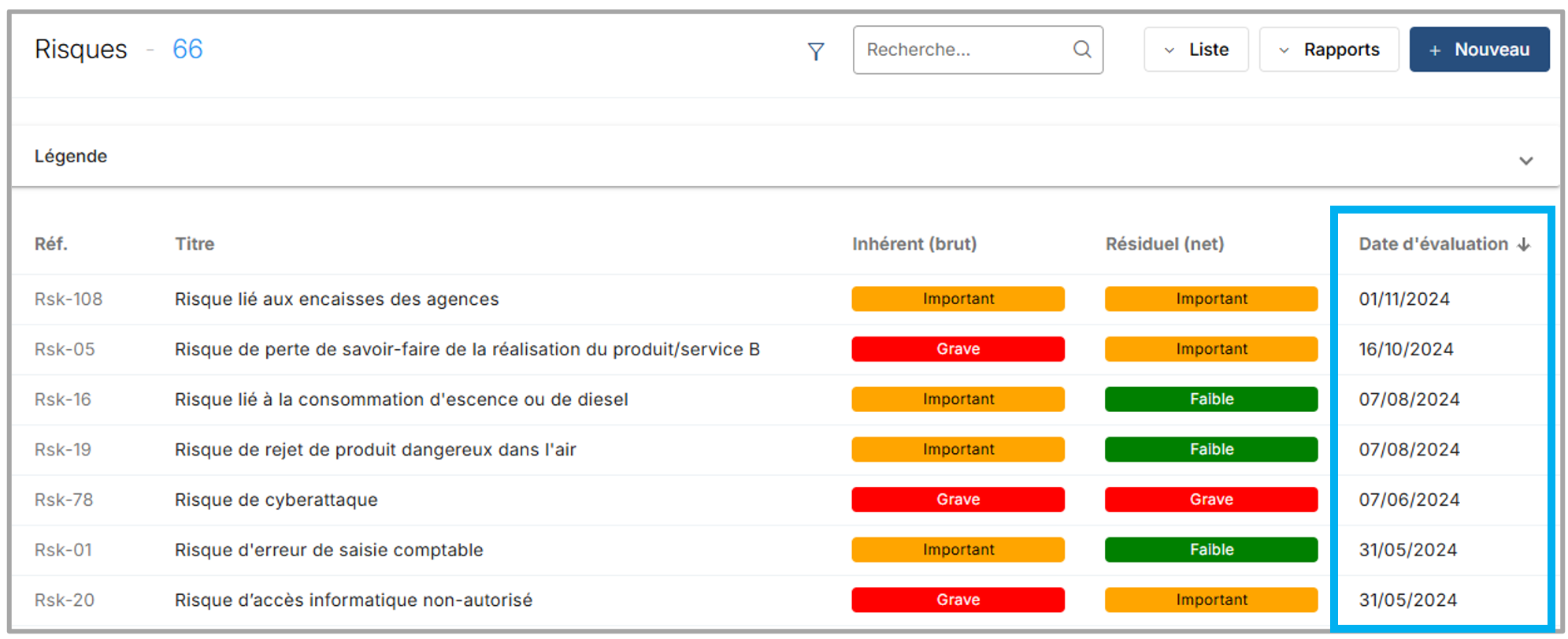 Retrouver la liste de l’ensemble de vos risques avec leur évaluation ici inhérente et résiduelle. Nous avons également une colonne avec la date de la dernière évaluation effectuée sur nos risques (correspond à l'opération de Figer le risque). Il est donc très facile de trier cette colonne pour voir les risques qui n’ont pas été revu depuis un certain temps.