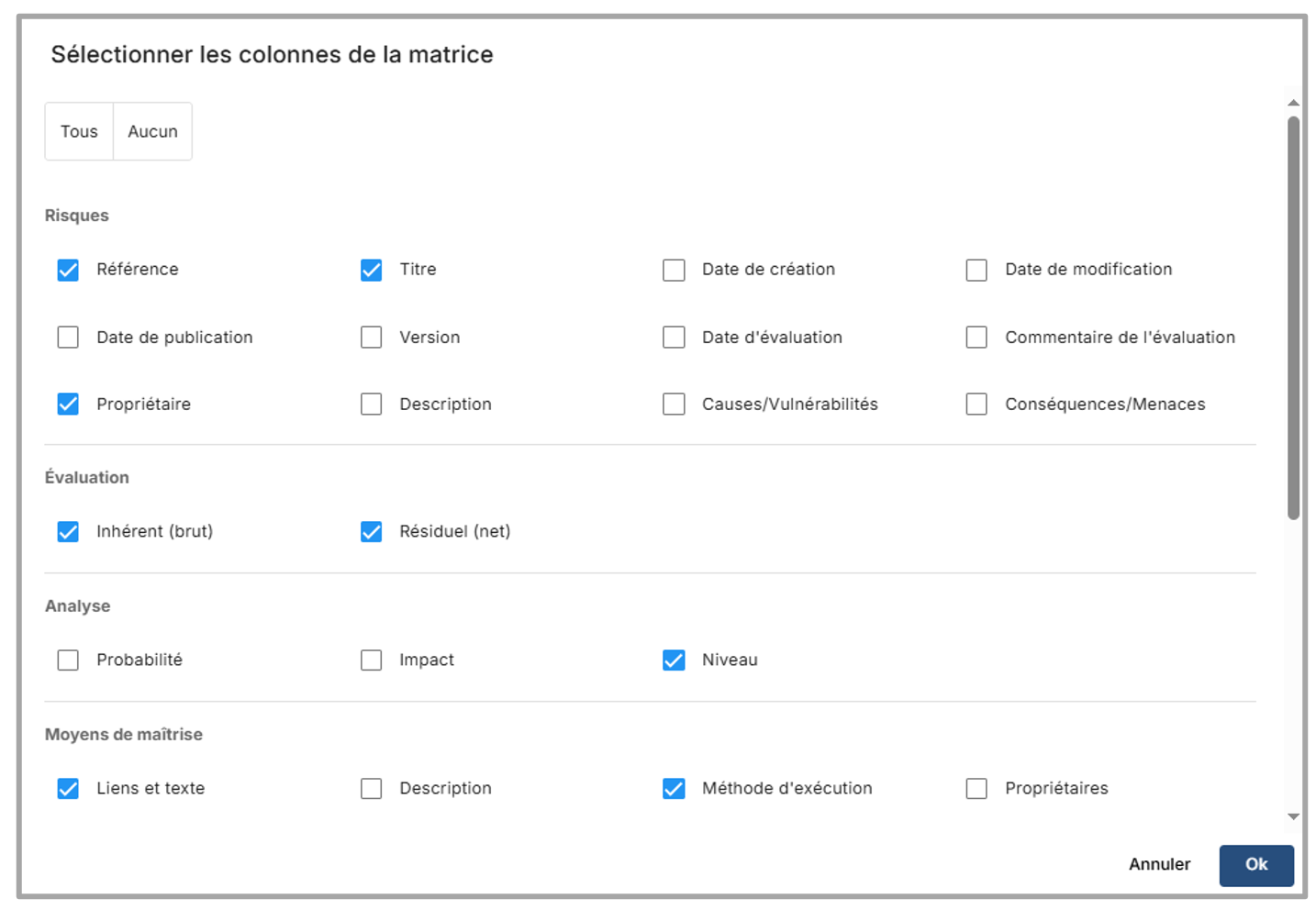 Sélectionner les colonnes à afficher et cliquer sur OK pour mettre à jour la matrice