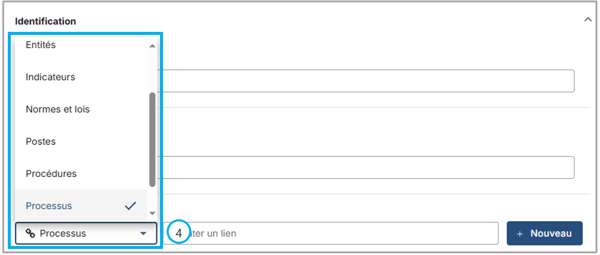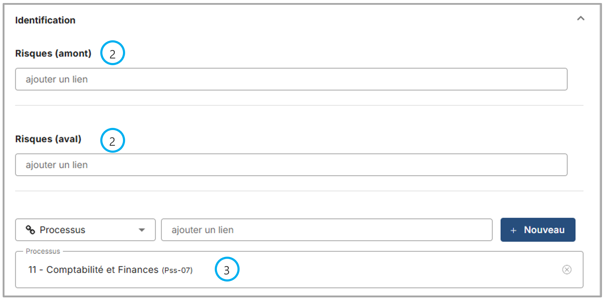 - d'autres modules d'Optimiso Suite afin d'indiquer où se trouve votre risque. Par exemple dans quelles entités/services/département, s’il est lié à un indicateur, à une procédure, etc.
