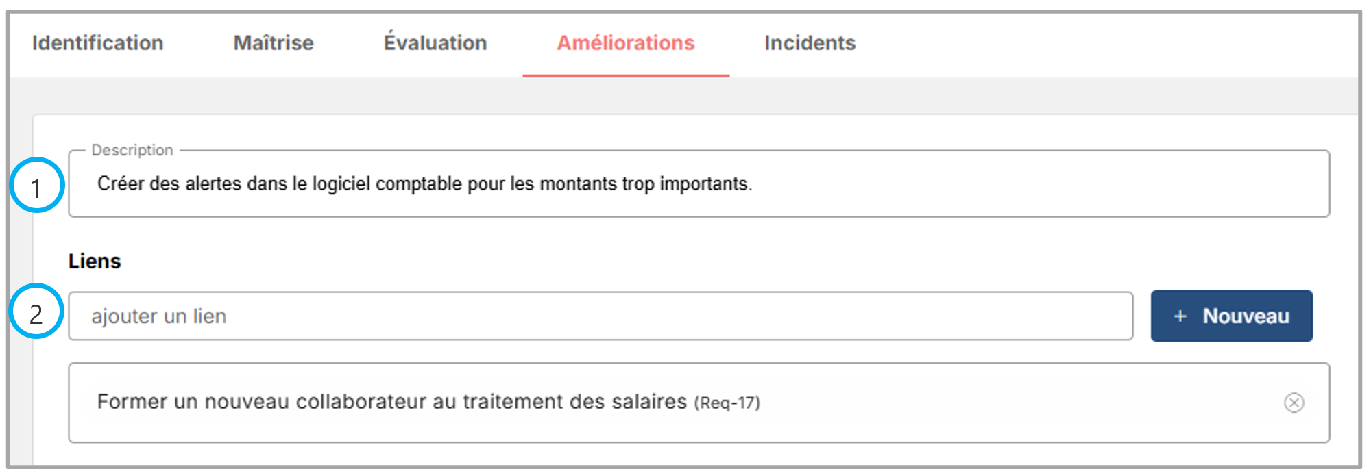 - la zone de liens pour lier votre risque à l’amélioration existante