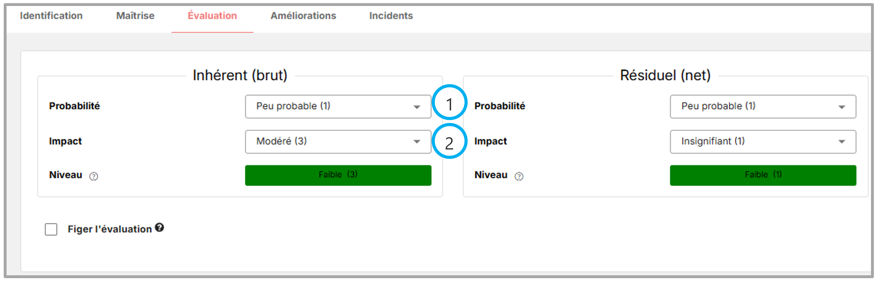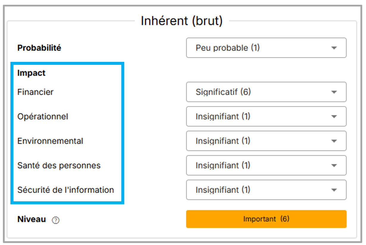 Le calcul du Niveau de risque se fait automatiquement et correspond à la probabilité x l’impact. Si vous avez paramétré plusieurs impacts, celui avec la note la plus élevée est prise en compte.