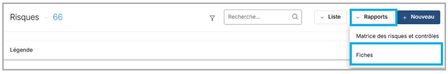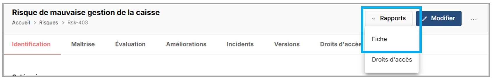 Pour exporter la fiche du risque, cliquer sur le bouton Rapports directement depuis votre risque.