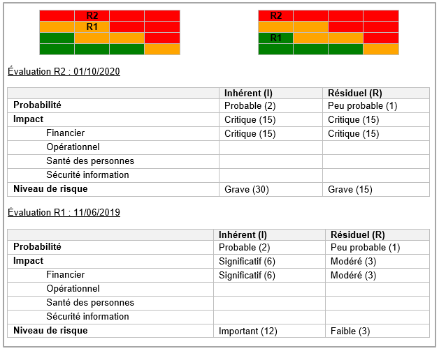 L’évolution du risque détaillée montre le niveau du risque à travers le temps avec le détail de l’évaluation et représenté dans une cartographie.