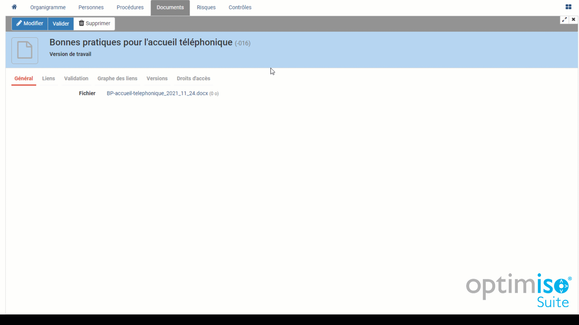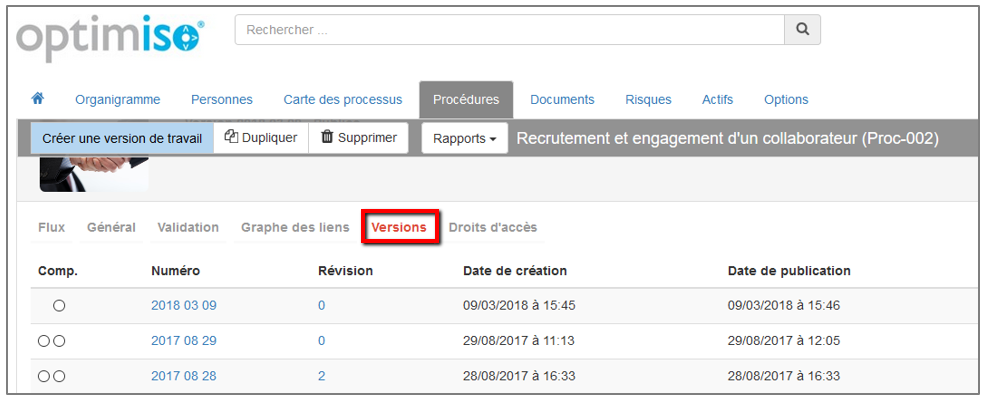 Le versionnement manuel peut être activé sur l’ensemble des modules Optimiso Suite. En configuration de base, seuls les modules documents et procédures sont en versionnement manuel.