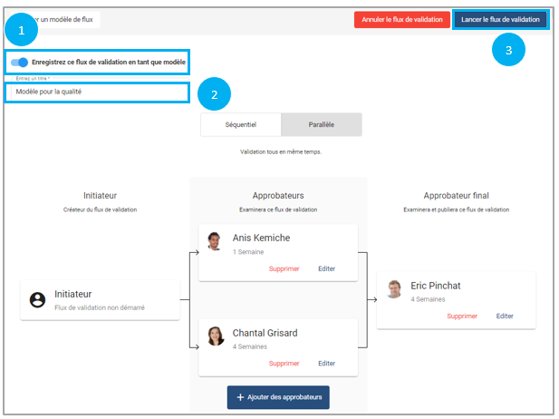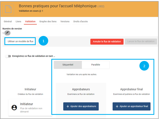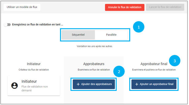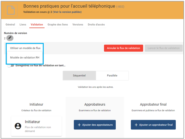 - Si vous avez préenregistré des modèles de flux de validation (cf. point 3.3), vous pouvez en choisir un en cliquant sur Utiliser un modèle de flux