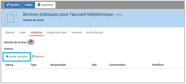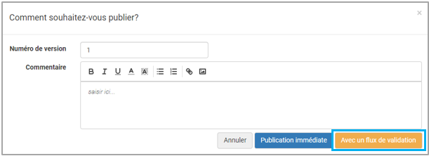 - Saisir un numéro de version et sélectionner Avec un flux de validation