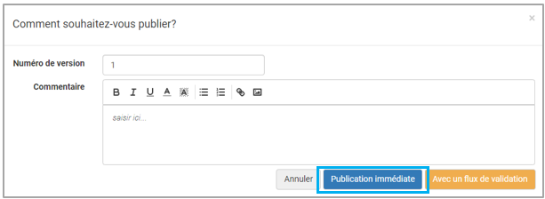 - Saisir un numéro de version et sélectionner Publication immédiate