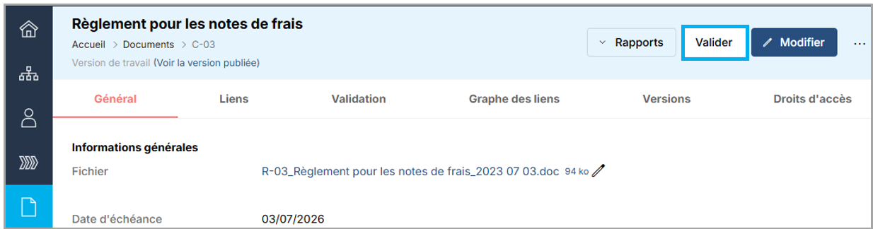Ci-dessous le document est en cours de validation (bandeau orange), il n’est plus possible de modifier la version de travail.