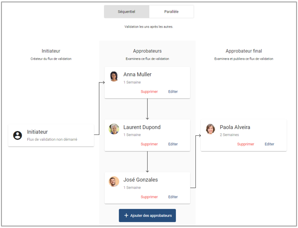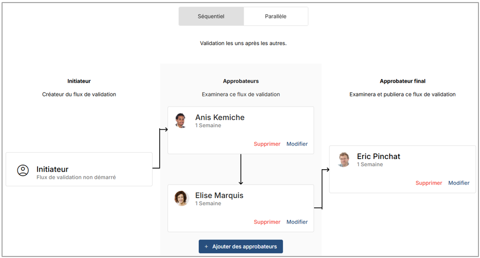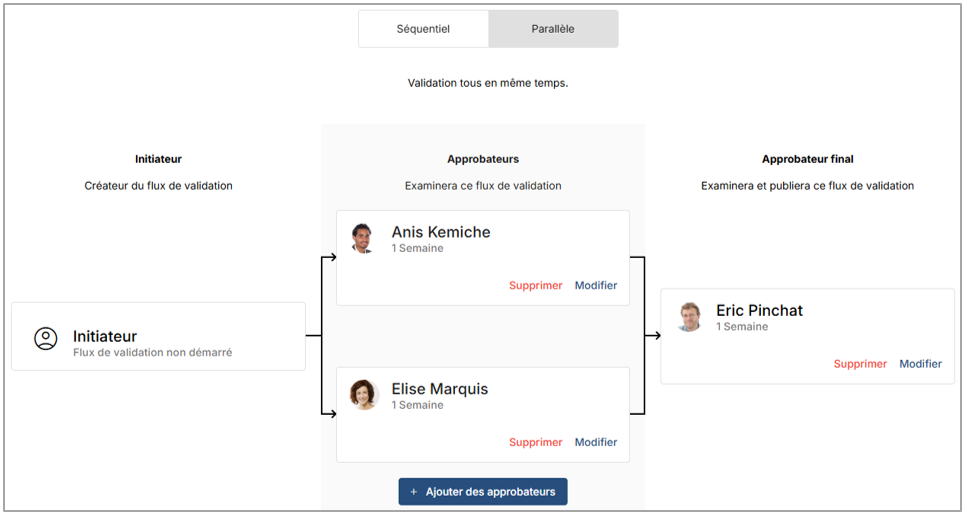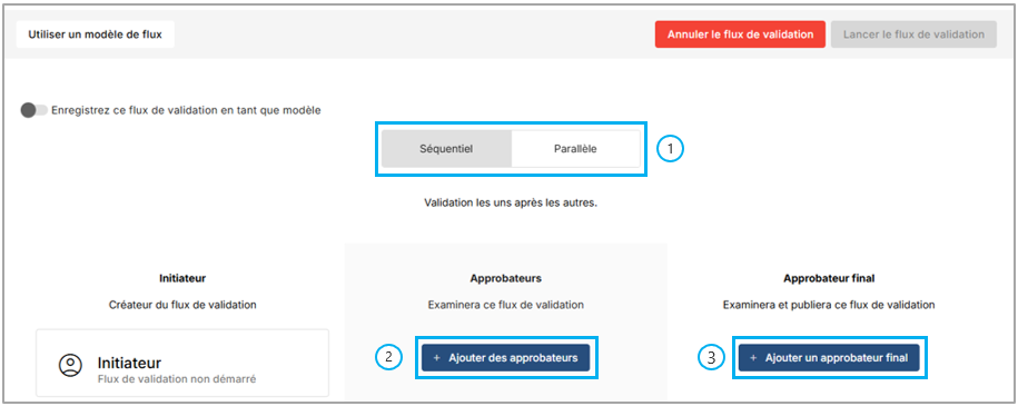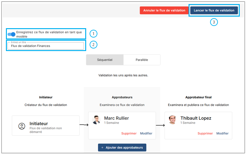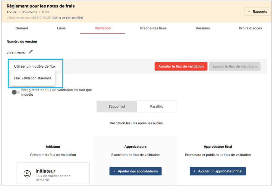 - Si vous avez préenregistré des modèles de flux de validation (cf. point 3.3), vous pouvez en choisir un en cliquant sur Utiliser un modèle de flux
