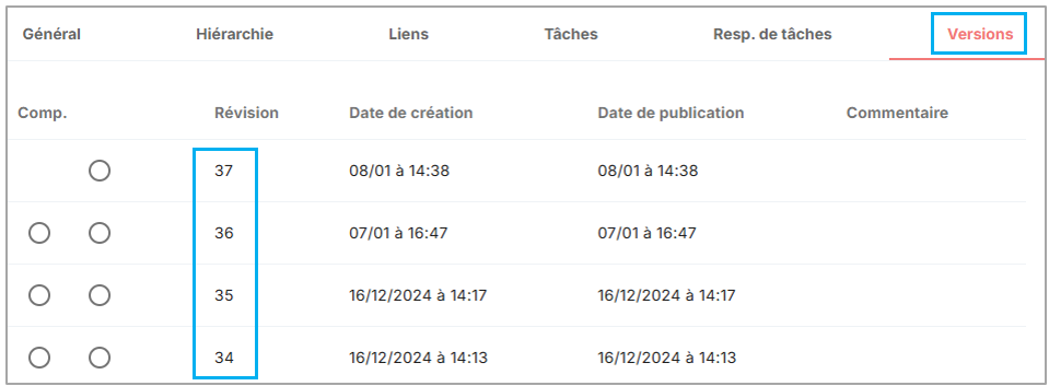 Ci-dessous un module versionné manuellement. La colonne Numéro correspond à la version inscrite manuellement pr l'utilisateur et la colonne Révision les changements apportés par le logiciel (ex : nouveau lien).