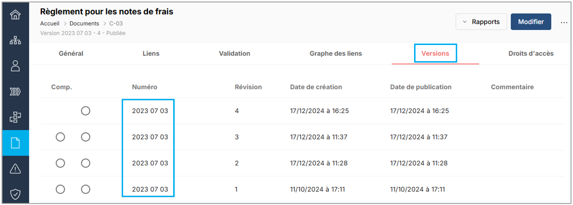 - Révision : numéro donné automatiquement par le logiciel à chaque modification d’un élément (personne, document, contrôle, …)