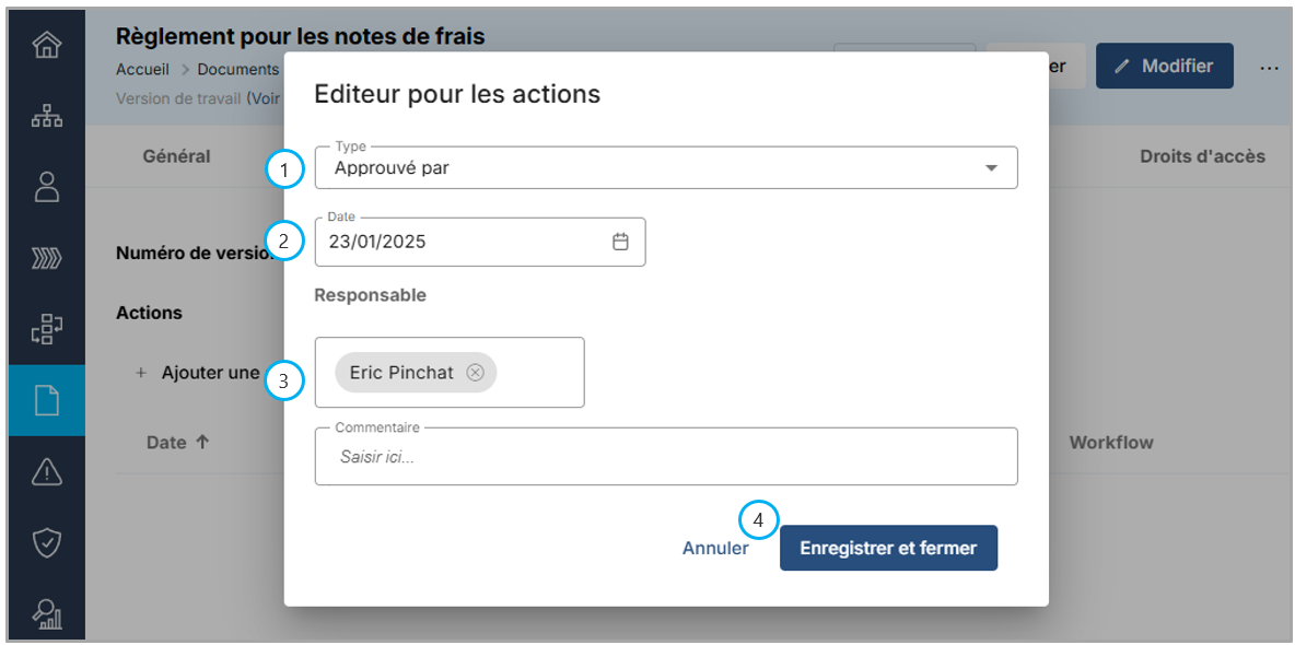 1. Sélectionner dans la liste déroulante le type d’action (pour modifier cette liste, aller dans Options > Versions > Version action types (JSON))