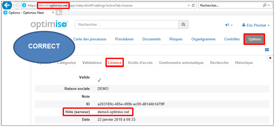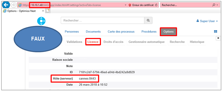 Pour remédier à ce problème, rendez vous dans l'onglet Licence dans les Options et utilisez l'URL présent à la ligne Hôte (serveur).