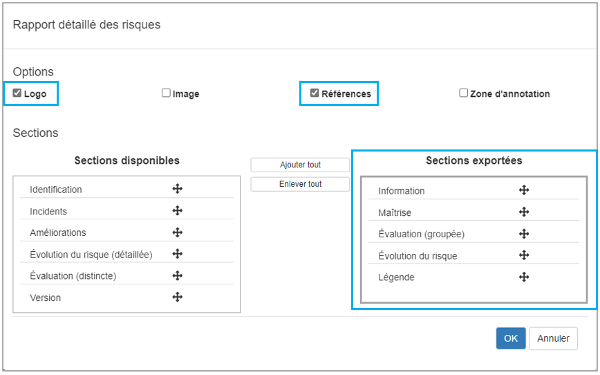 Pour les rapports en format Word, vous pouvez cocher les sections que vous souhaitez afficher.