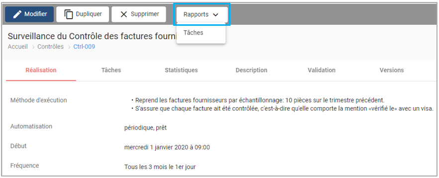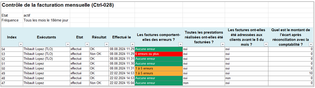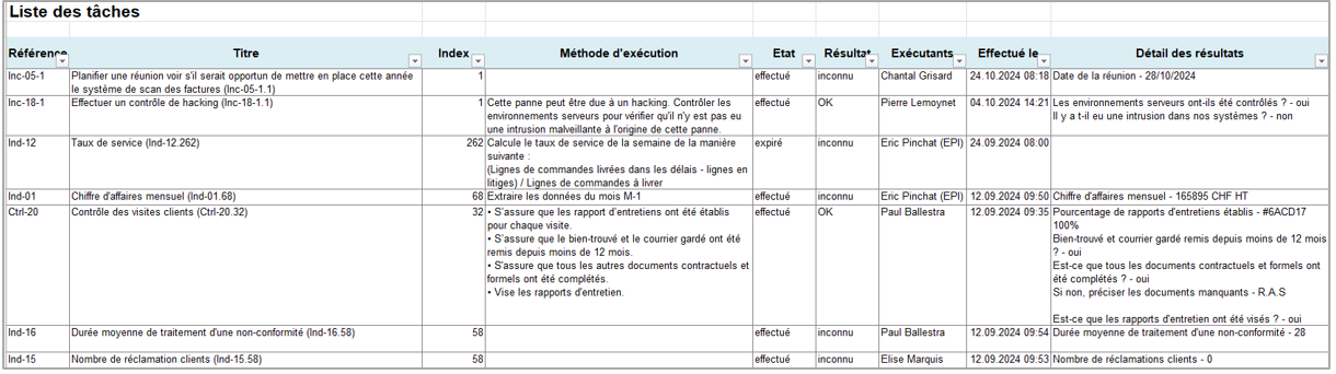 À noter que pour les rapports concernant 1 élément en particulier (ci-dessous Ctrl-028) figure une colonne pour chaque champ de résultat alors que pour les rapports qui concernent plusieurs éléments (ci-dessous les tâches de tous les modules) les champs de résultat figurent dans une seule colonne.