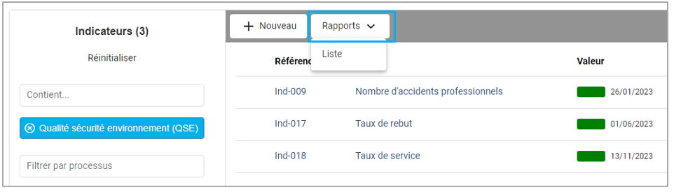 Pour exporter les données de plusieurs éléments du module, cliquer sur Rapports.