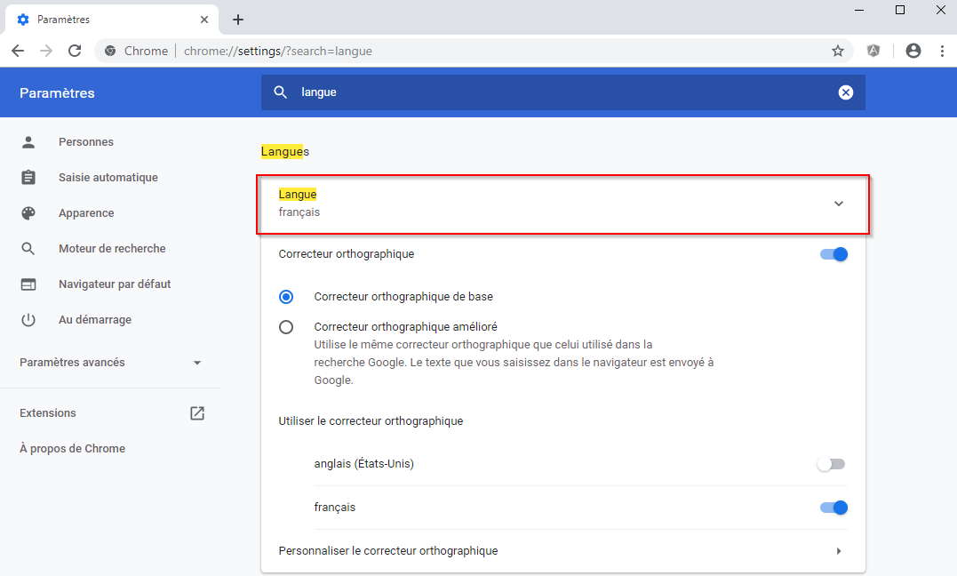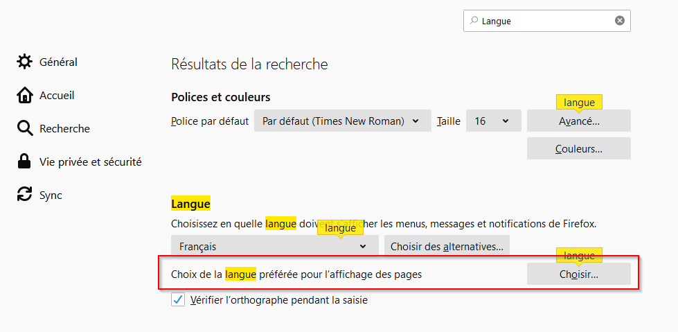 - Dans la section Langue, clique sur le boutons Choisir... pour sélectionner la langue préférée pour l’affichage des pages