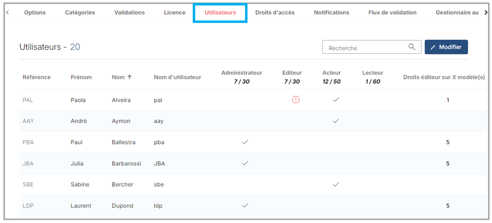 Vous retrouvez ici la liste de toutes les personnes qui possèdent un accès à la plateforme avec leur type d’utilisateur.