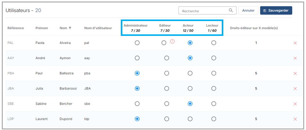 3) Sélectionner le type d'utilisateur selon votre nombre de licence : Administrateur, Editeur, Acteur ou Lecteur