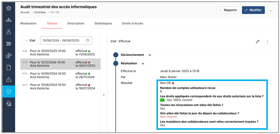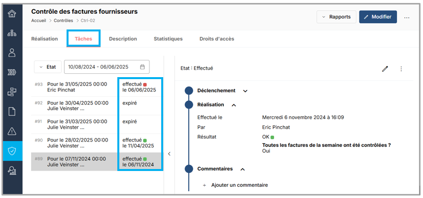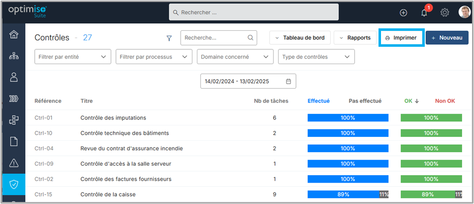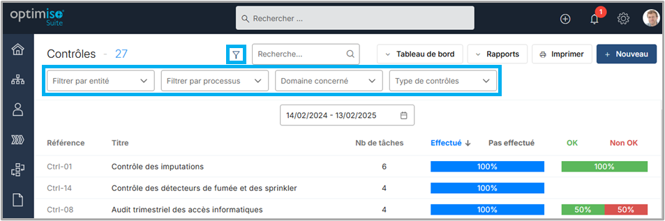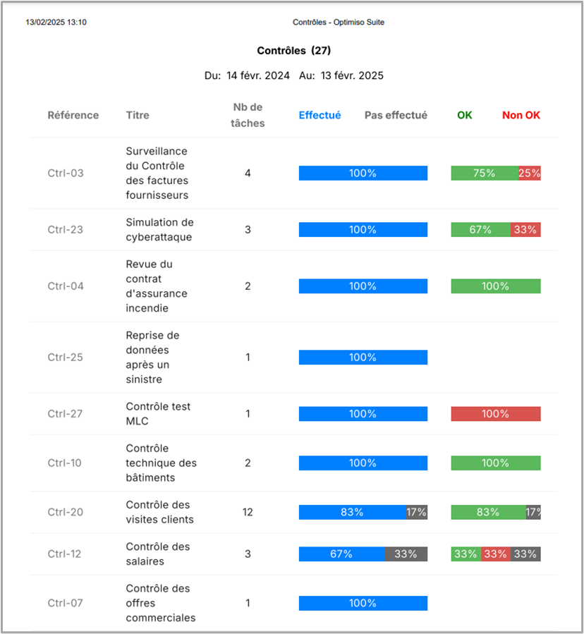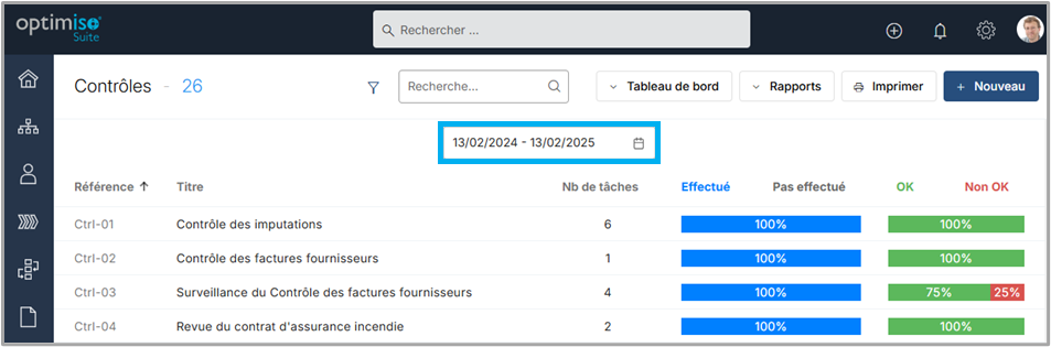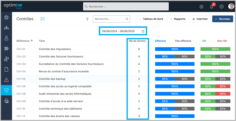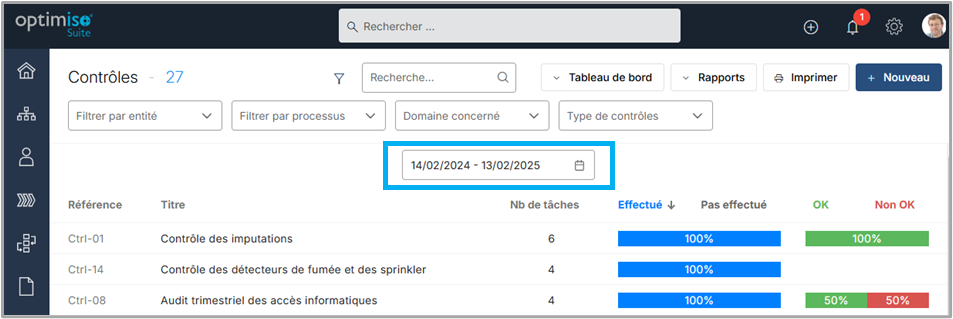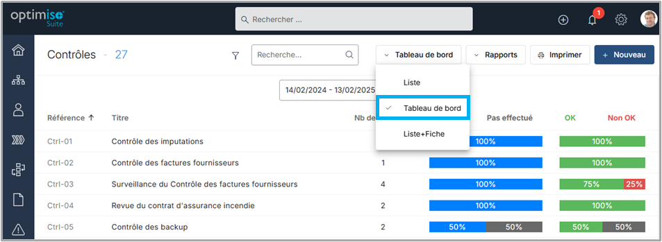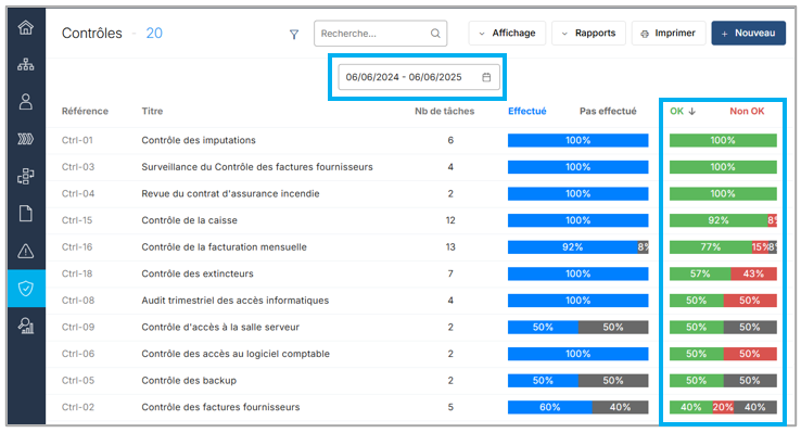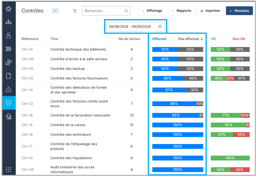 L'affichage tableau de bord permet de consulter rapidement le taux de tâches effectuées ou non pour chaque contrôle, sur une période donnée.